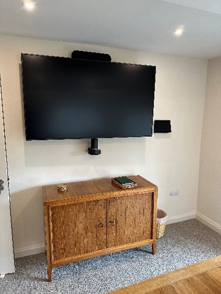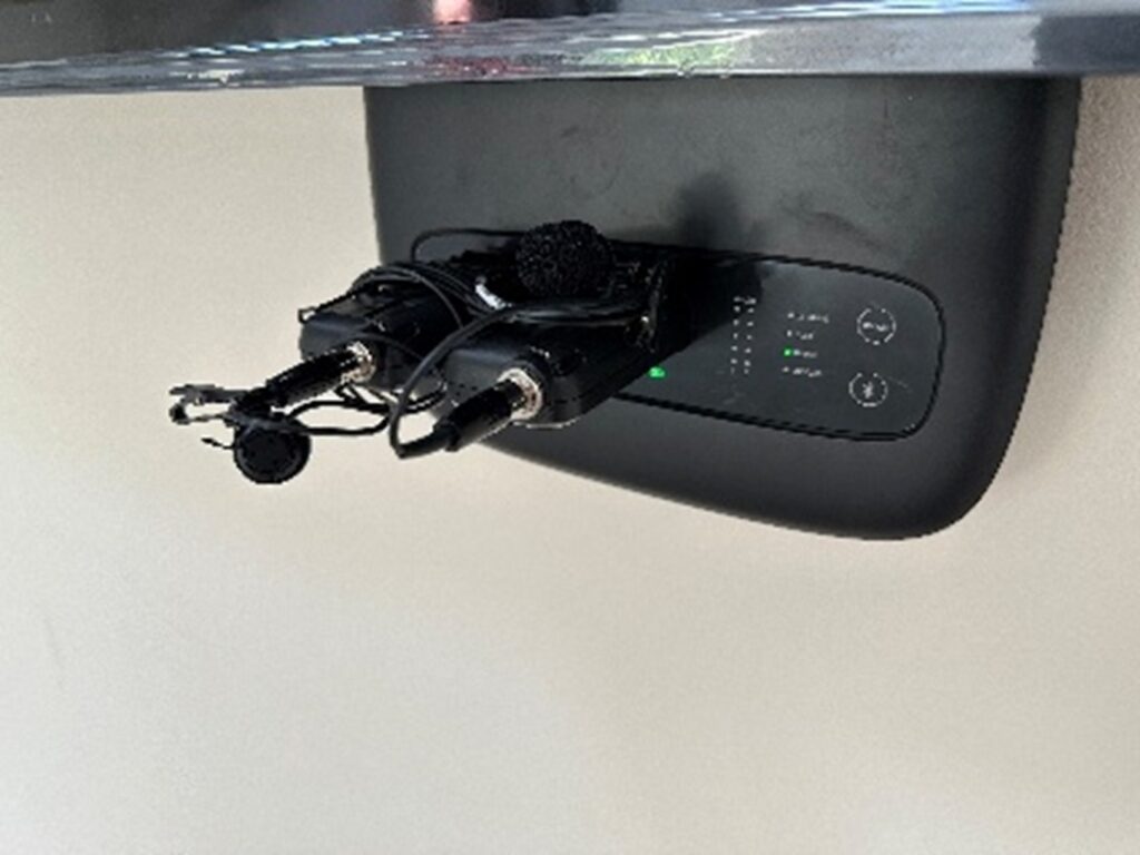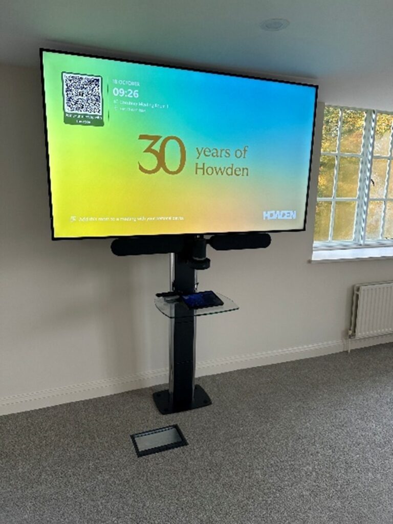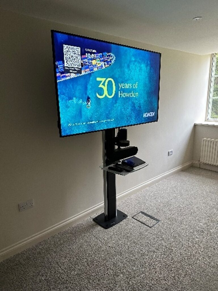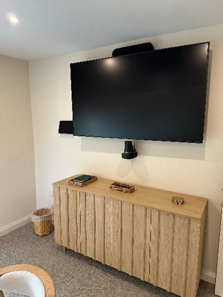 Hisense display screens along the front wall, plus three additional 75” screens on mobile stands—all of which connect to the Crestron Room Control system. Flexibility was essential since the room’s configuration often changes; the system was programmed to adapt accordingly. Sometimes, all screens are used; other times, only half are needed, or just one screen on a trolley with a Logitech video conferencing camera is required for smaller meetings. To ensure clear audio throughout the room, each display screen features a powerful speaker bar mounted above it. Additionally, two self-charging wireless lapel microphones were installed discreetly under one of the screens, making voice announcements easily accessible