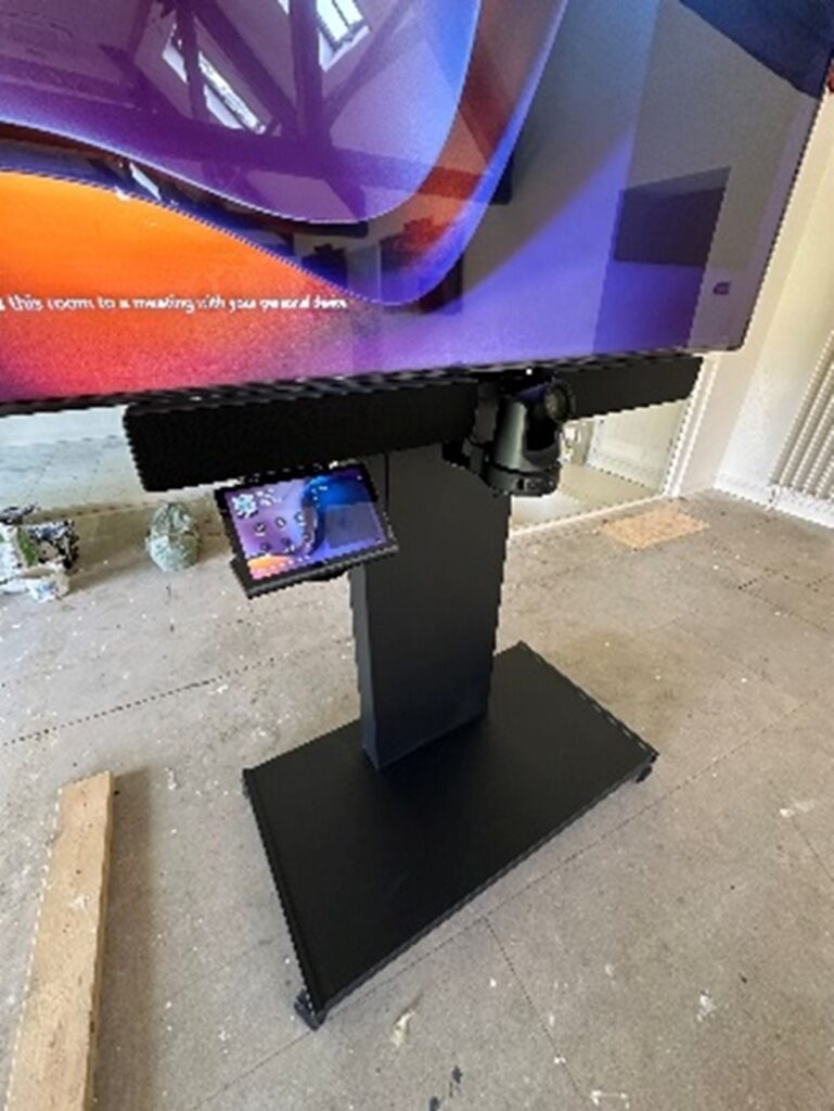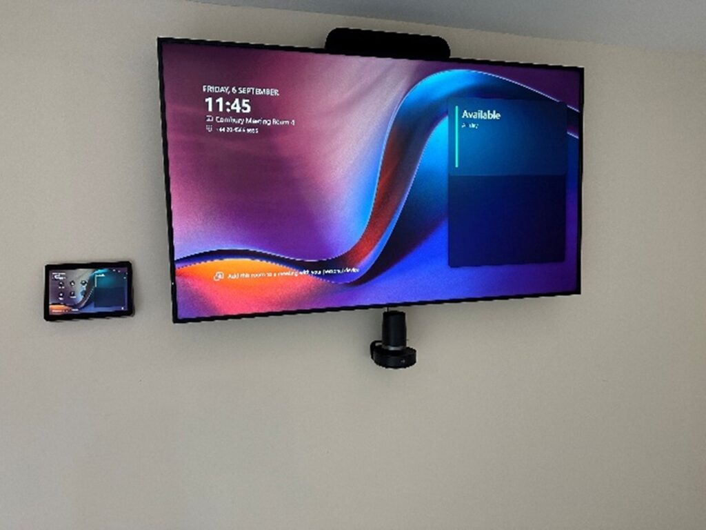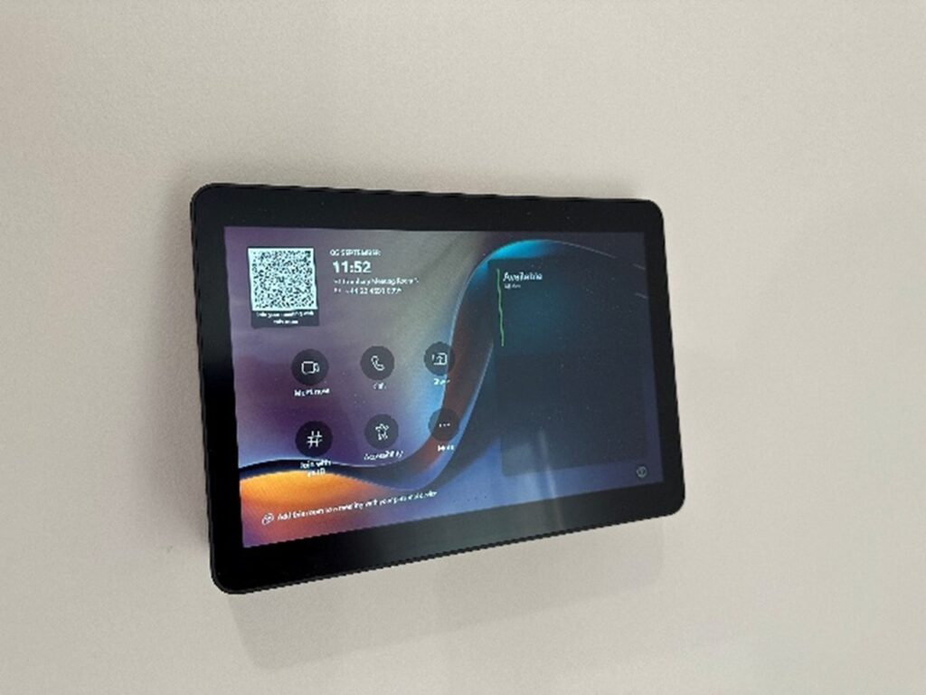 Vangis installed Hisense 65” or 75” screens in each room, mounted on either the wall or a fixed floor stand. Every room included a Logitech video conferencing camera, speaker bar, ceiling microphones, and TAP touch controller for ease of use.