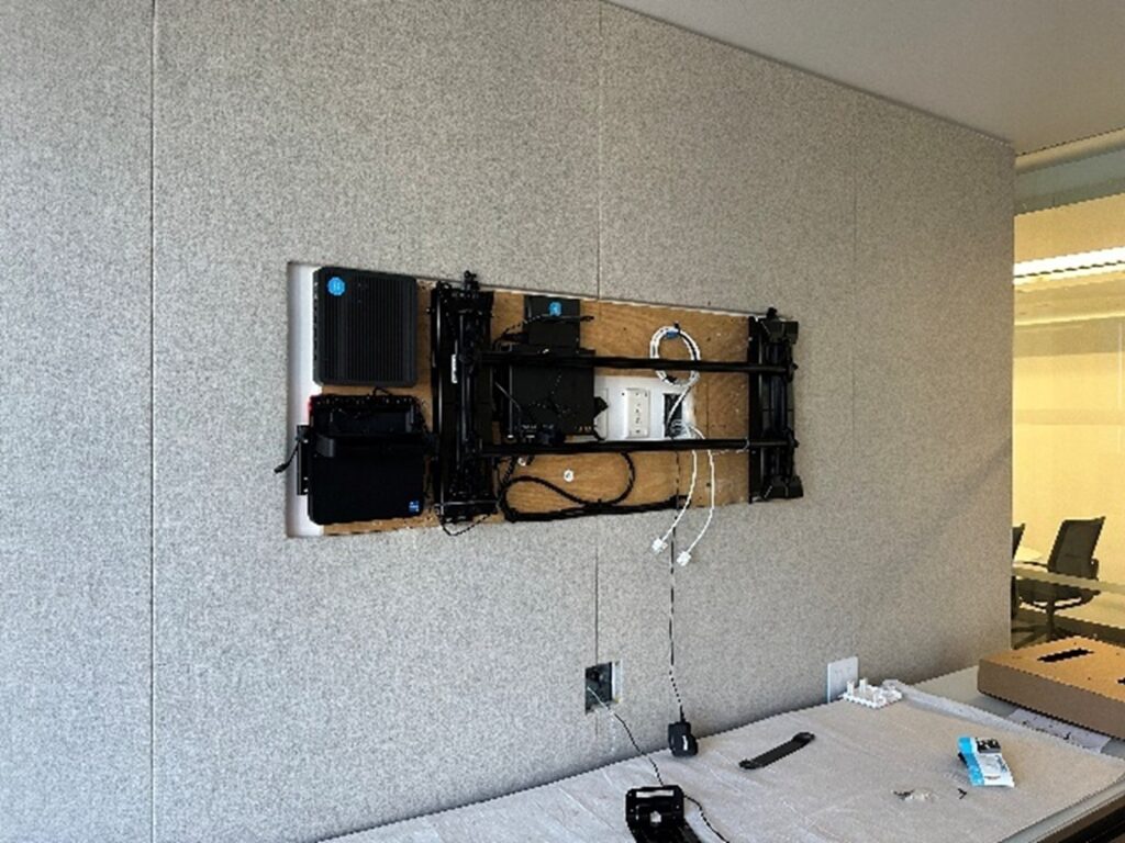 In the huddle rooms, we installed 55” Samsung displays with Logitech Meetup video bars, integrating camera, microphone, and speaker, also paired with TAP touchscreens for simple operation.